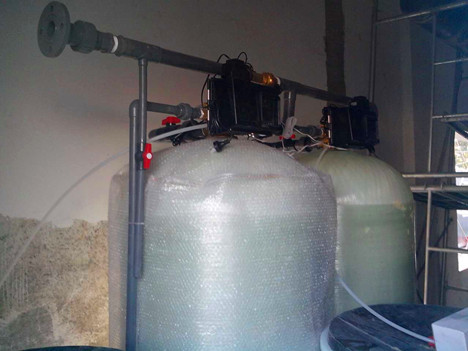 系统通过离子交换原理,去除水中钙、镁等结垢离子,使水质软化。系统是由树脂罐、盐罐(软化树脂)、控制器等组成的设备。系统采用虹吸原理吸盐,自动注水化盐、配比浓度无需盐泵、溶盐等附属设备钠离子交换软化处理的原理是将原水通过钠型阳离子交换树脂,使水中的硬度成分Ca2+、Mg2+与树脂中的Na+相交换,从而吸附水中的Ca2+、Mg2+,使水得到软化。如以RNa代表钠型树脂,其交换过程如下: