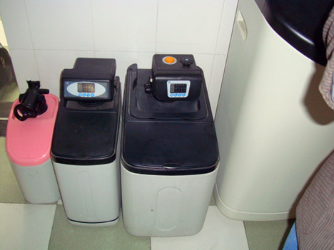 当含有钙、镁离子的原水通过软水器树脂层时,水中的钙、镁离子与树脂内的钠离子发生置换,树脂吸咐了钙镁离子而钠离子进入水中,这样从软水器中流出的水就是去掉了钙、镁离子的软化水。随着交换过程的不断进行,树脂中的钠离子全部被置换而达到饱和后就失去了交换功能,此时使用软水盐溶液对树脂进行再生,将树脂吸咐的钙、镁离子置换下来,树脂重新吸咐了钠离子,就恢复了软化交换能力。